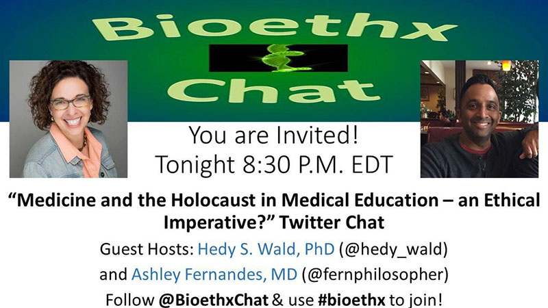 In order to explore this subject matter in a less geographically-bound format: I guest hosted a Twitterchat with Dr. Ashley Fernandes for #bioethx (April, 2016); to my knowledge, the first such use of Twitter platform for this topic. Twitter can be a valuable learning tool in healthcare education and academic pursuits, offering the opportunity to share scholarship, research, and curricula with a wider audience to increase influence of the work, enhance continuing professional development, and advocate for change. Our Twitterchat offered reflection-inviting questions on teaching about physician and medical establishment roles in the Nazi era, applying lessons of the Holocaust to contemporary ethical issues in medicine, and effective integration of medicine and the Holocaust curriculum in healthcare professions education.